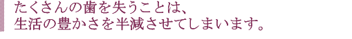 残念ながら、いかに良く出来た義歯やインプラントでも天然の歯の機能の全てを補うことはできません。あなたご自身の歯は、失ってわかるかけがえのない宝物です。