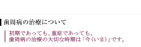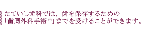 たていし歯科口腔外科クリニックでは初期の治療から、重症の方の歯を保存するための歯周外科手術※までを受けることができます(※当クリニックは歯周組織再生誘導手術を行うことを認可されています)。皆様の歯周病の正しい理解をお手伝し、今(いま)を大切にして診療いたします。