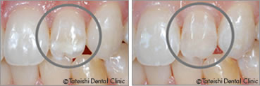 コンポジットレジンという硬い樹脂で、むし歯、生まれつきの歯の表面の白濁の治療、軽度の形の修正を行います。前歯が主体ですが奥歯では上下の歯が咬みあわない小さな溝に適しています。